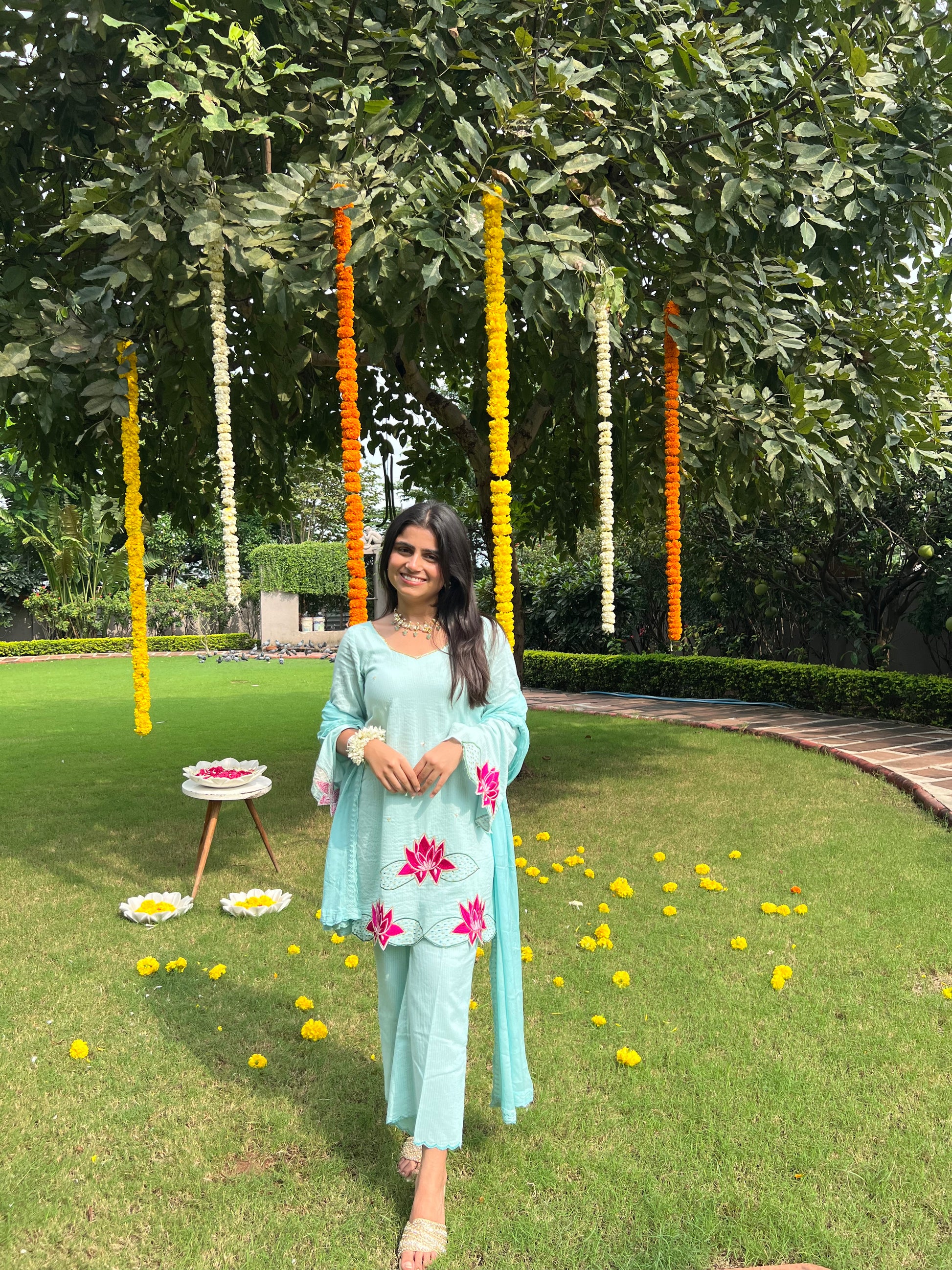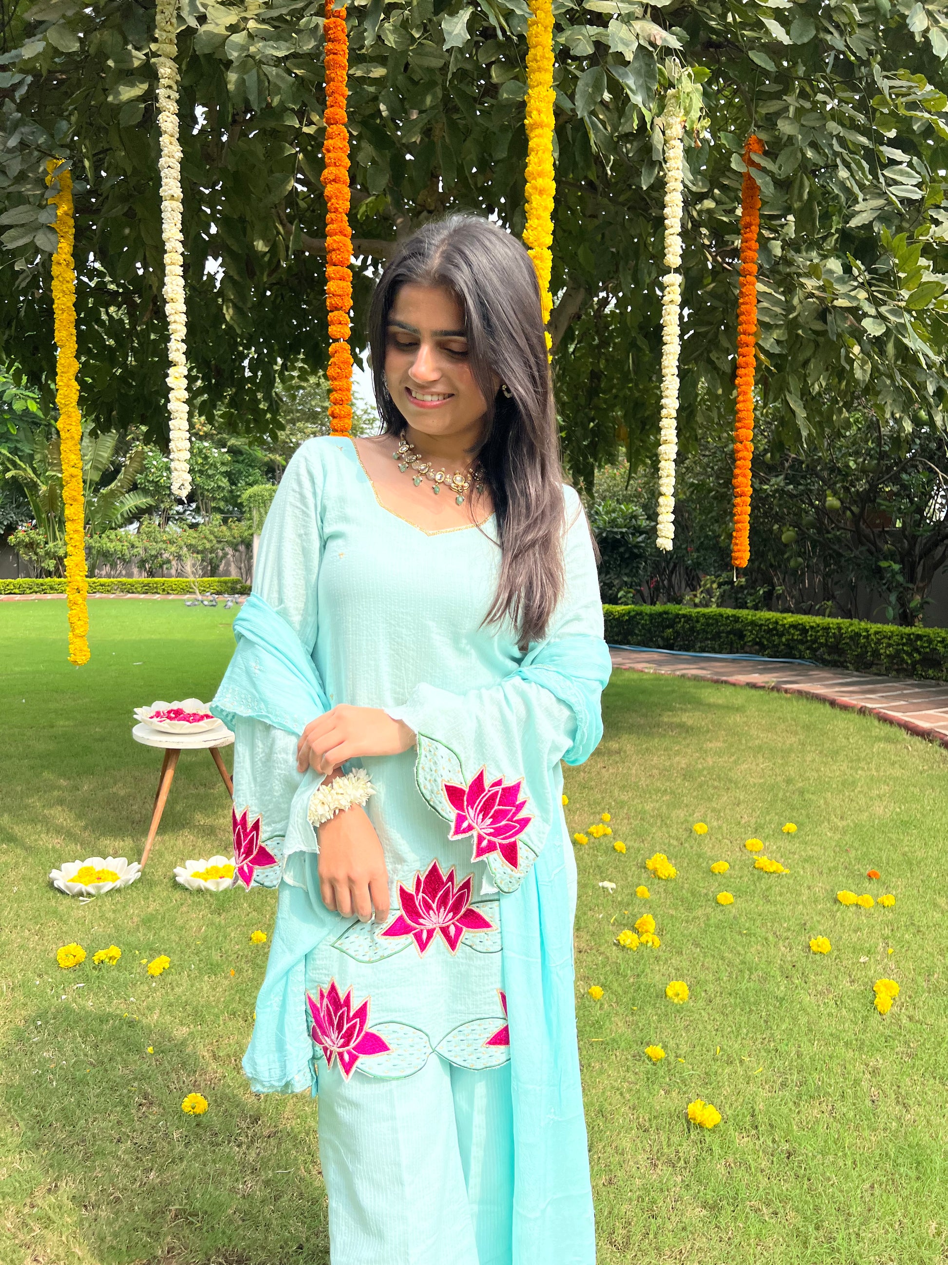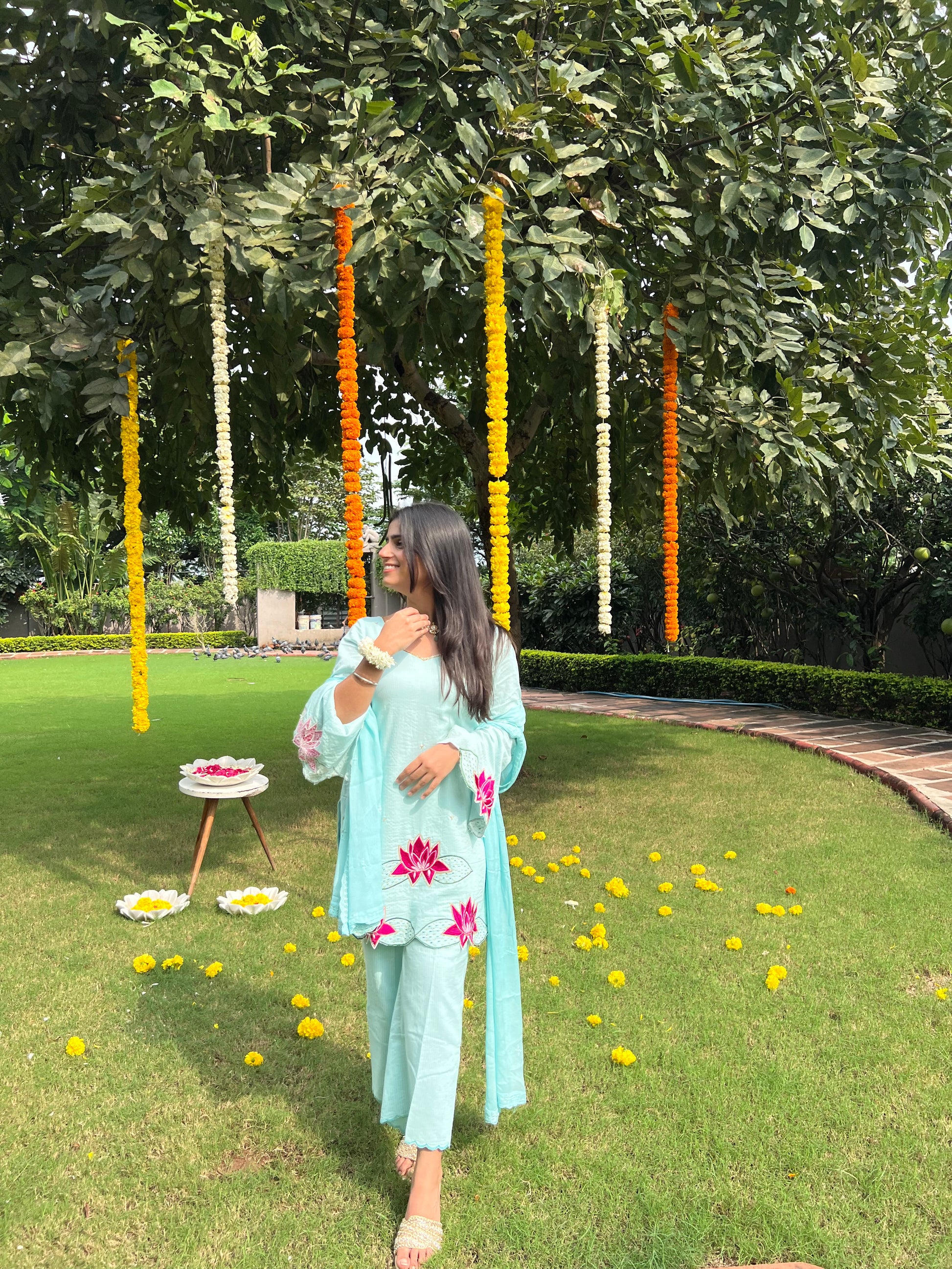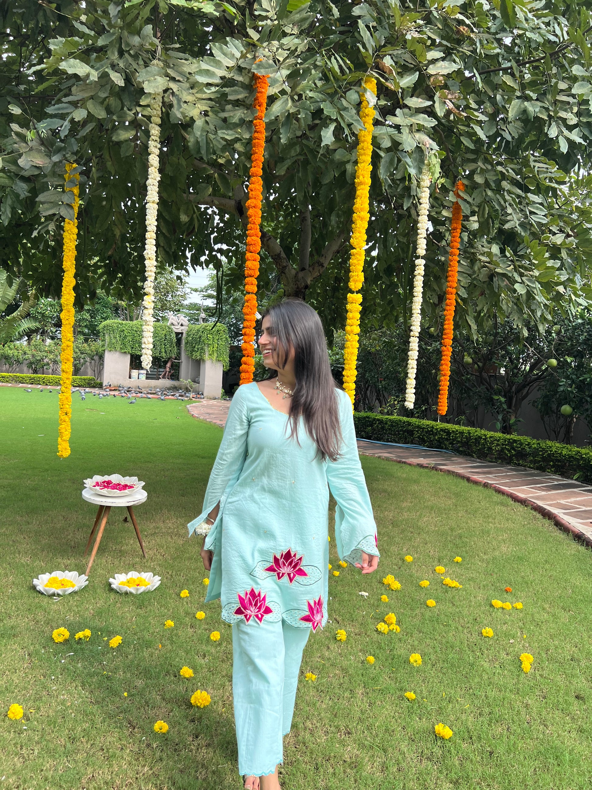 A refreshing take on festive dressing. This aqua blue kurta and pants co-ord is crafted in breathable cotton kantha and adorned with delicate lotus hand embroidery all over. Scalloped detailing at the edges adds a graceful finish, making it a statement of mindful elegance, ideal for intimate celebrations and joyous evenings.