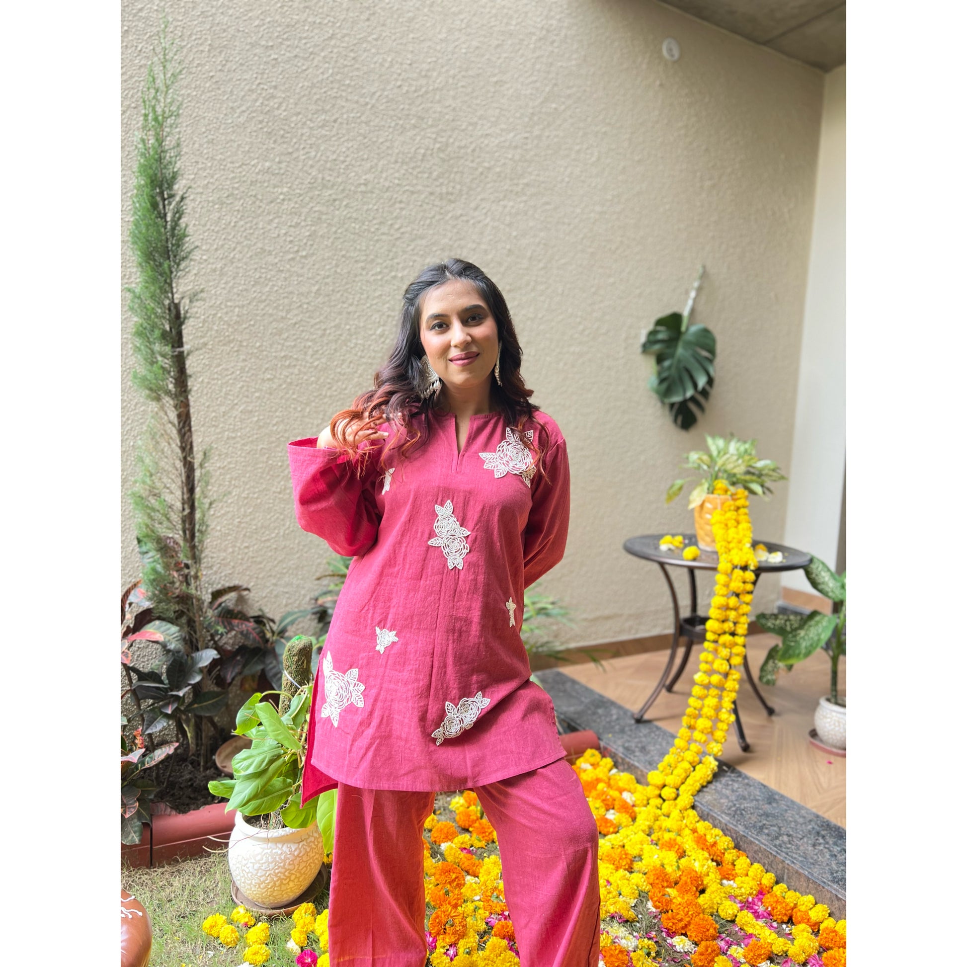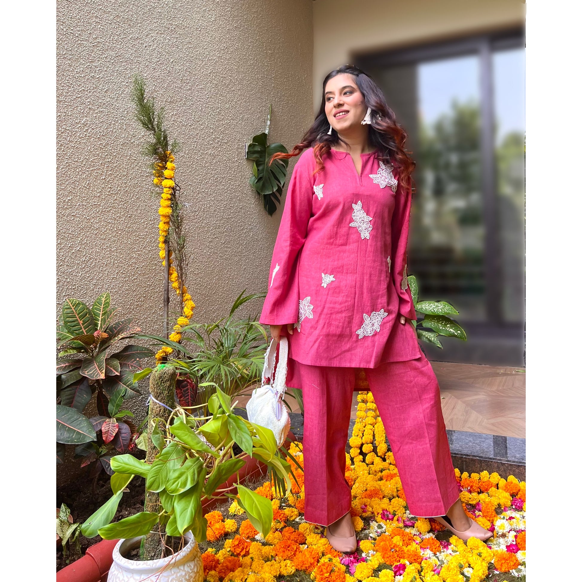 Hot pink with a touch of romance. Adorned with hand-beaded white roses and made in a breathable organic cotton-muslin blend, this kurta and pants co-ord is your go-to for effortless festive dressing.